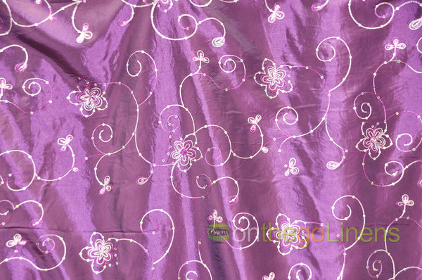 Aurora Taffeta is a flowered embroidery on a taffeta, boasting a two tone background and multicolor, sequin accents. It is highly versatile, commonly used in the event industry for tablecloths and linens, as well as in costumes and apparel for stylish tops and eye-catching accents.
