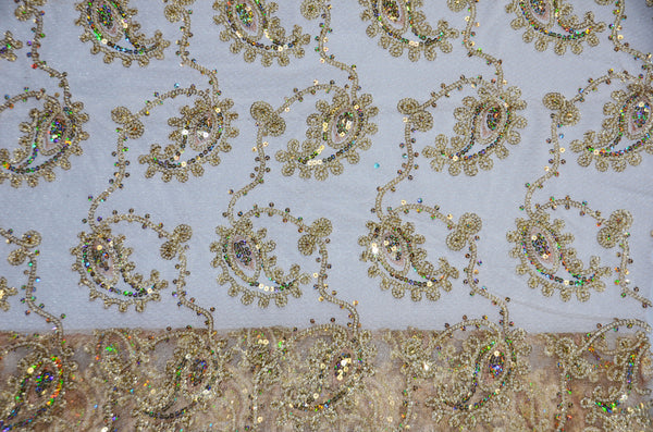 Coco Paisley is a transparent fabric with a paisley design and shimmering sequin accents. Both ends of the fabric feature scalloped edges, and the embroidery has a metallic sheen. This fabric has a semi-transparent quality and exudes a Moroccan and Indian flair. Event planners can incorporate this fabric into Moroccan-themed canapes and accents, while party rental companies can use it to create overlays and sashes.