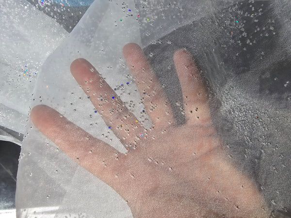 Bottom side of the picture is taken with the fabric piled together to give the true impression of the color of the fabric. The top portion of the fabric is taken as a single layer of the Sparkle Organza over a white polyester. Fabric is sheer open work and taken with or without flash to give the customer an idea of tone of color. - Please order a sample swatch to avoid any issues.