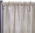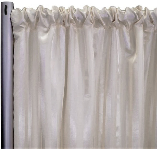 The Bridal Satin 1" Tuxedo Stripe Event Drapery Panel features a subtle, tone-on-tone jacquard design. This stripe is also referred to as a Tuxedo Stripe in the market, and its texture transforms from a dull to shiny finish for a dynamic look. The stripe is approximately 1" wide and runs horizontally along the width of the fabric.