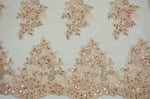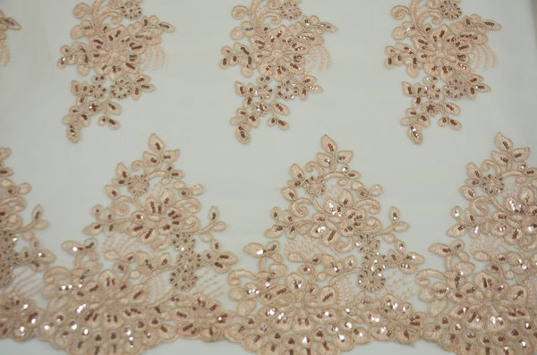 Camilla Embroidery Fabric is a Flower Embroidery with Sequins, Design YX 1098. Its background mesh matches the embroidery color. Please note that the picture may not accurately represent the background color due to being taken over a white polyester fabric. This fabric is perfect for apparel, wedding dresses, and event industry overlays and tablecloths.