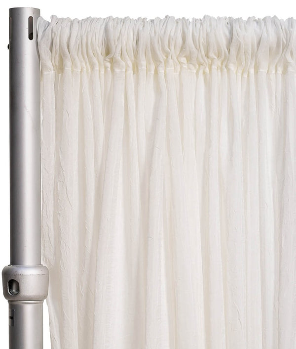 The Crush Voile is inherently fire retardant and meets industry standards such as NFPA 701 and California Standards with a Fire Marshall Stamp. Available in a standard width of 108" and customizable height, this product is versatile for any event. For unique sizes, please reach out to our team for assistance. Our pockets are 6" and include a complimentary one on top. The sides of the Crush Voile are left natural for a clean look, while the bottom is finished with a serge edge. For an additional cost, a pocket can be added to the bottom. A minimum order of 6 pieces is required and a manufacturing time of 3 to 5 business days is needed.