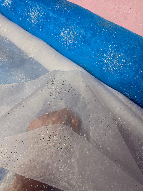 Sparkle Organza is a sheer fabric adorned with glistening beads that create a stunning tablecloth for any event. This fabric is perfect for a winter wonderland themed occasion. With sparkling diamond beads scattered in clusters, it adds an elegant touch to your event decor. Best suited for use as tablecloths, overlays, and runners, it also works beautifully as a draped accent piece.
