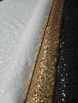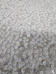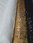 This fabric is a Taffeta Sequins combination, featuring full-coverage Sequin Embroidery and widely used in event spaces for drapery panels. The Embroidery showcases 3mm dangling Sequins, skillfully attached to a solid Taffeta base. It is recommended to solely utilize this fabric for Tablecloths, linens, overlays, runners, Chair Caps, Chair Jackets, because it can add a touch of elegance to any event.