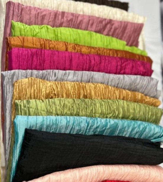 This taffeta fabric, also known as crushed or accordion taffeta, is horizontally crushed with a textured appearance. It is a popular choice in the Costume and Theatrical Scene, often used for creating modern versions of past time outfits. The crushing occurs parallel to the fabric width in an accordion-like fashion. Made of 100% Polyester.