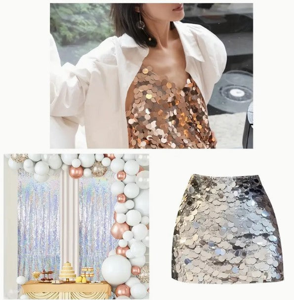 Enhance your fabric collection with our Payette Sequins Fabric by the Yard, featuring 9mm round sequins sewn onto a mesh background. As the largest sequins in our selection, they add a unique touch to tops, skirts, and costumes. Use them to create stunning cake decorations, cards, and specialty linens. The fabric's 100% polyester mesh base showcases embroidered sequins spaced throughout for a luxurious look. Our Payette Sequin Fabric Bolts are perfect for custom-sized tablecloths, drapes, backdrops, bouquet wraps, ceiling decor, and more. With each wholesale bolt featuring intricately stitched metallic Payette sequins, you can trust the quality of our products to impress at your next event.