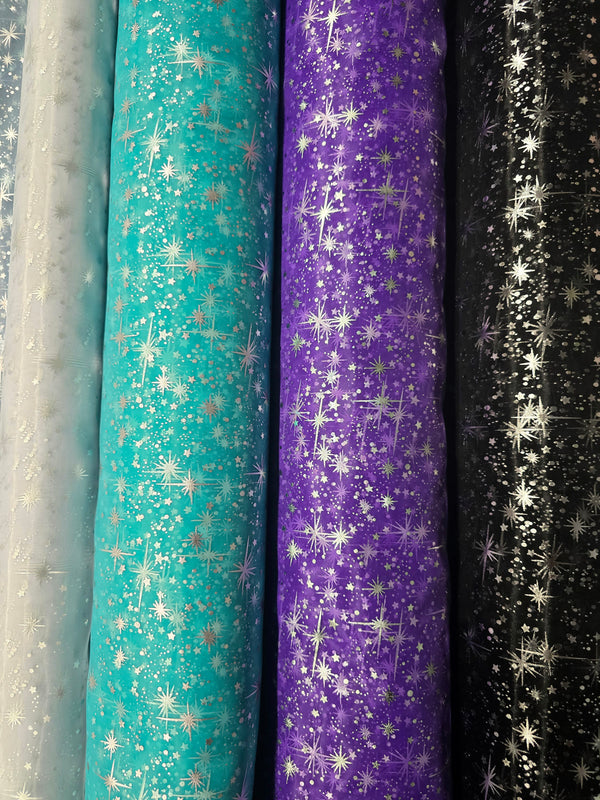 Star Foil Organza is a 60" wide plain smooth organza, featuring a sheer background and Silver Foil Stars. The soft and smooth texture adds a touch of elegance to any project. Available in multiple colors, this fabric is perfect for children's clothing, costumes, or event party and planning.